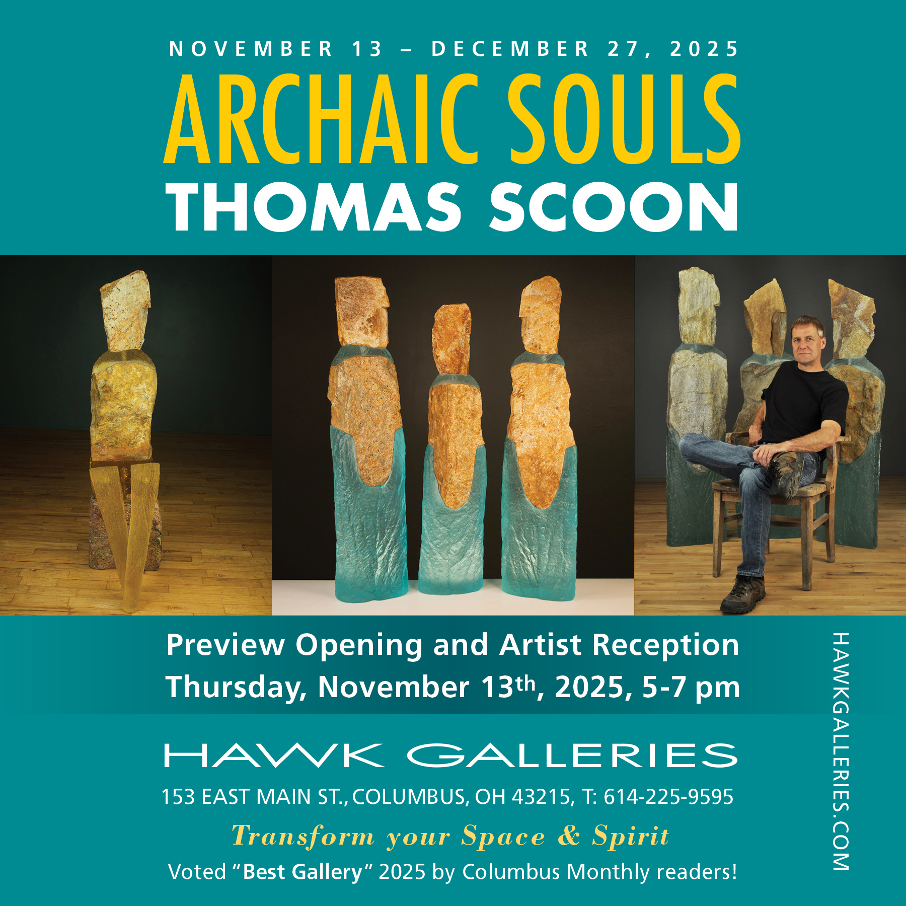 Artist Thomas Scoon unveils his abstract figurative sculpture in a Preview Opening and Artist Reception at Hawk Galleries, 153 E. Main St., in downtown Columbus. Hawk Galleries was voted “Best Gallery 2025” by readers of Columbus Monthly magazine. Come meet New Hampshire-based Scoon and learn about his evolution as an artist