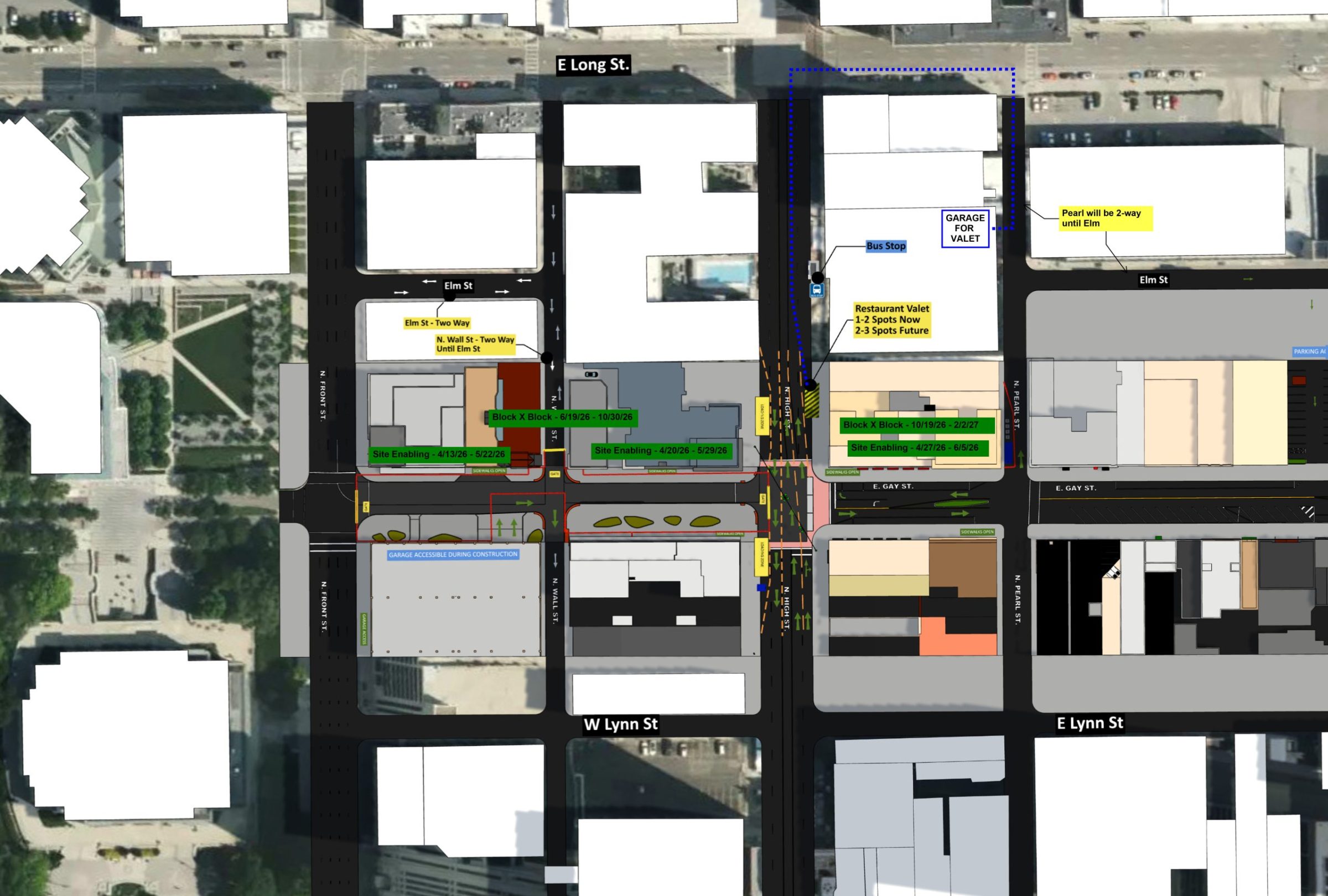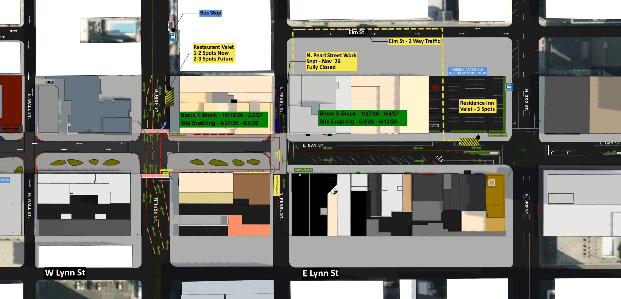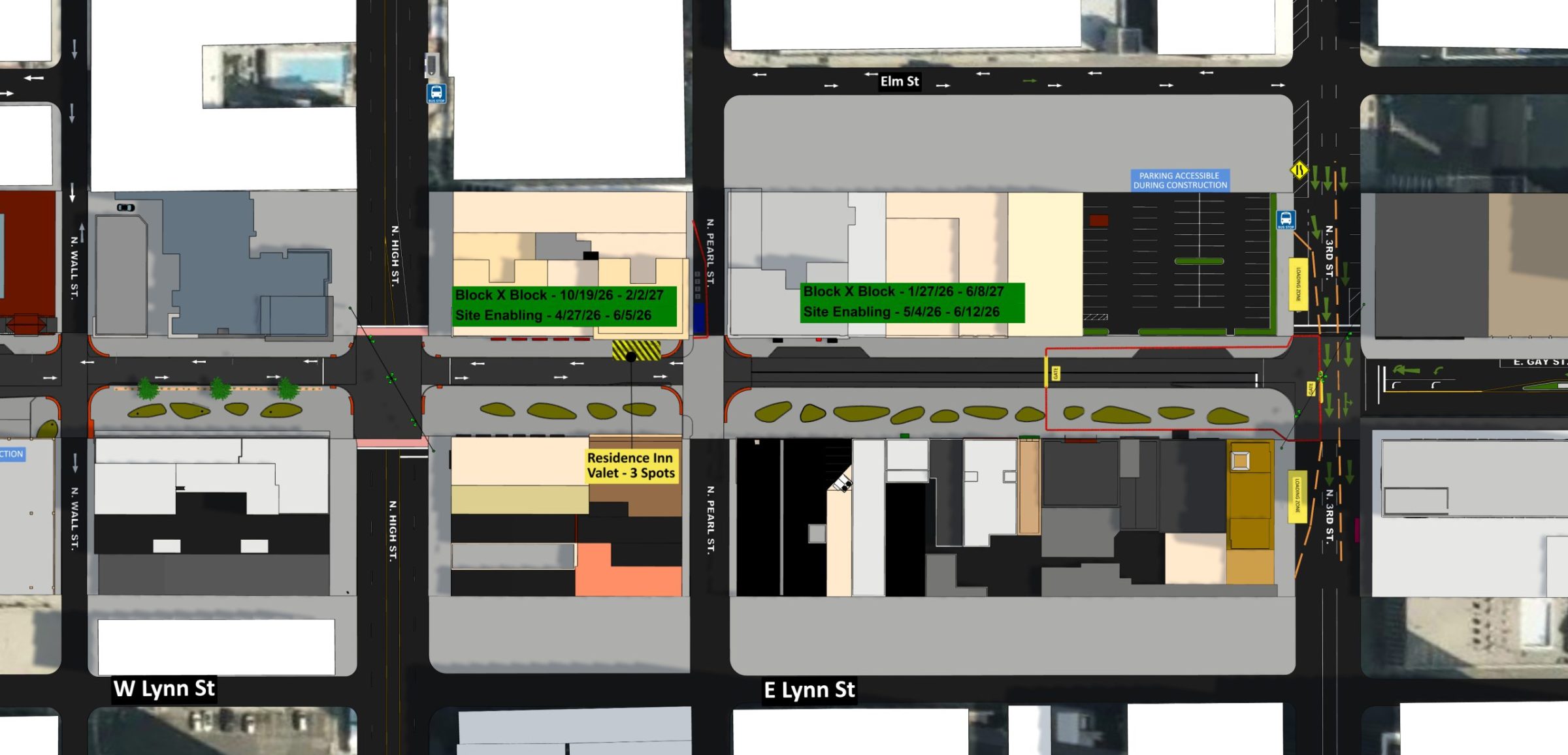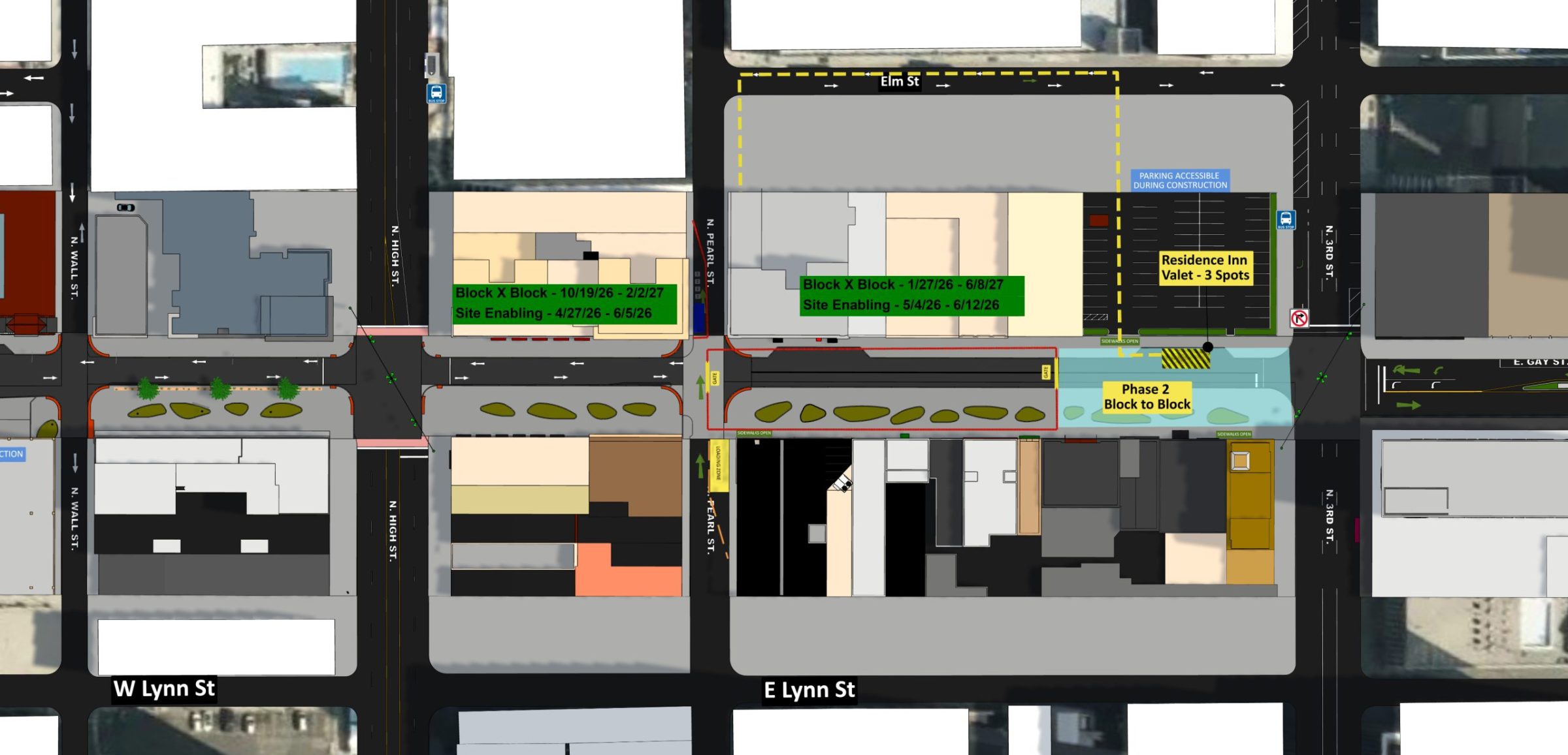 Starting the week of April 20 2026. Metered parking on Gay Street between Highand Third will no longer be accessible. Center islands and trees will also be removed.
